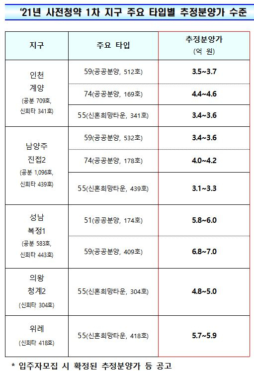 7월에는 3기 신도시인 인천 계양 (1천100호)을 비롯해 위례신도시 (400호), 성남복정지구 (1천호), 의왕청계2 (300호) 등 4개 지구가 가장 먼저 사전청약에 들어간다 사전청약. 복정1지구 공공분양 전용 59㎡는 6억8000만~7억원 선으로 이번 사전청약을 통해 공급되는 주택형 가운데 가장 비싸다.